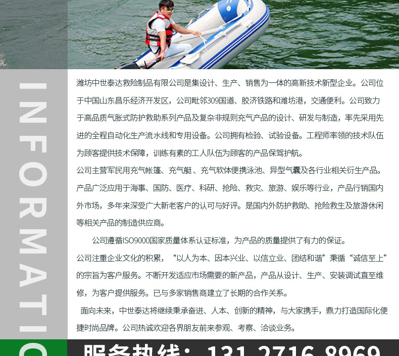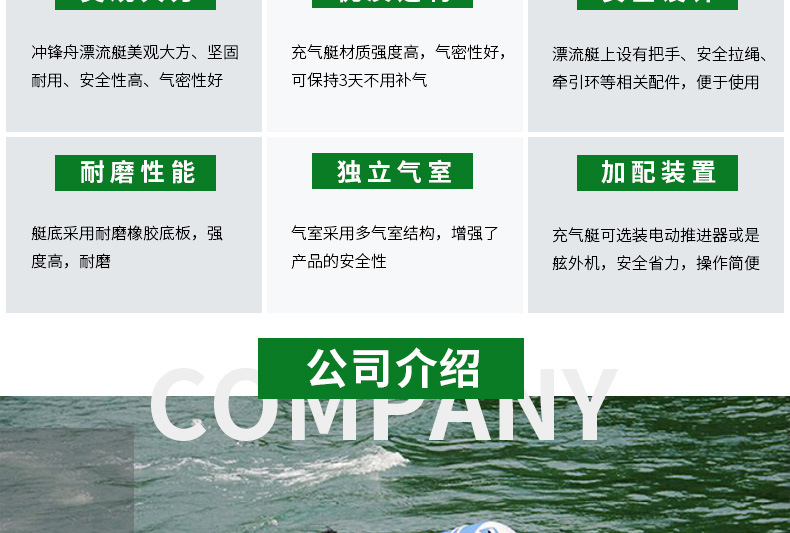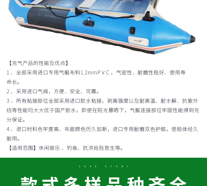 1、我公司生产的挂机艇设计新颖,造型美观。2、材料为尼龙精编PVC高强气密布,强度高,气密性好,可保持3天不用补气;3、艇上设有把手、安全拉绳、牵引环、船桨等相关配件,便于使用;4、艇底采用耐磨橡胶底板,强度高,耐磨,且设有锥型龙骨,减小了艇的划行阻力,降低了功率的损耗;内部底板采用防水木板或铝合金板,可供客户选择;5、气室采用多气室结构,增强了产品的安全性。6、发动机采用雅马哈汽油发动机。
